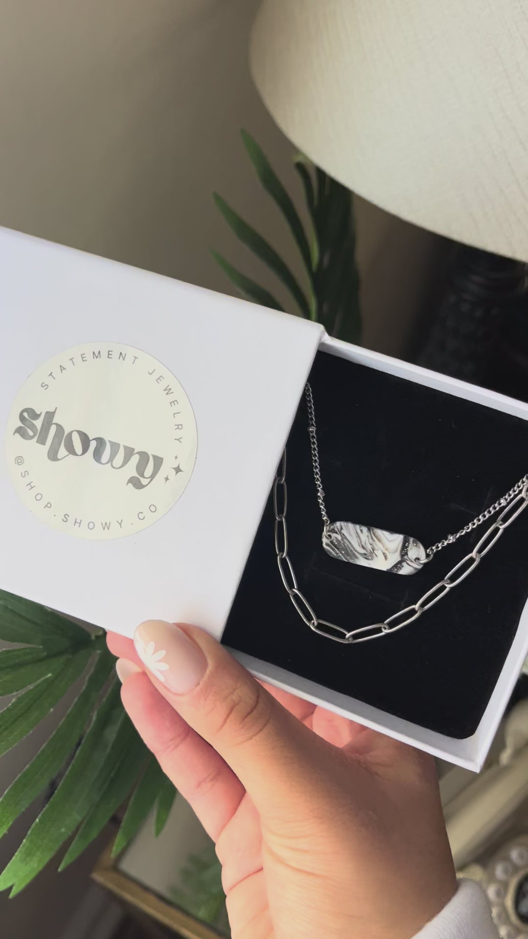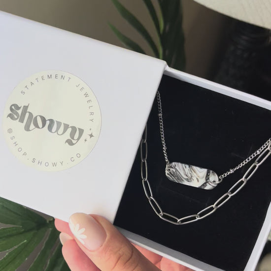 This elegant layered silver necklace features a unique handmade marbled pendant, combining delicate design with striking style.