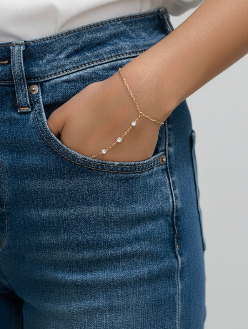 This delicate stainless steel gold hand chain bracelet adds a subtle sparkle to your look with four shimmering rhinestones. Its dainty design is perfect for girls who appreciate elegant, lightweight jewelry that makes a stylish statement. Ideal for everyday wear or special occasions, this hand chain effortlessly enhances your style with a touch of refined glamour.